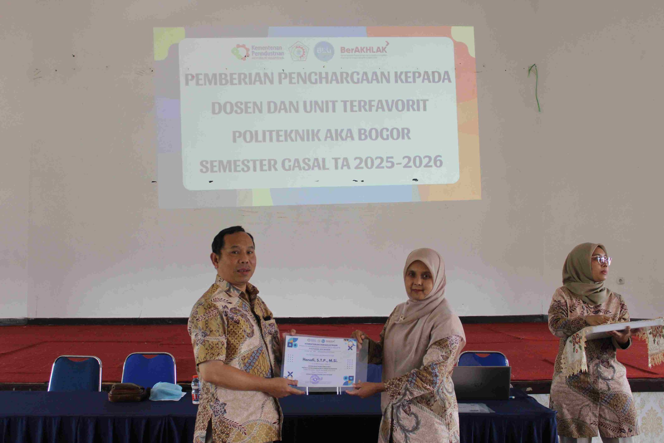 Sebagai rangkaian dari upaya pemacu semangat dan profesionalisme, Politeknik AKA Bogor juga mengumumkan para peraih apresiasi Dosen, Tim Praktik, dan Unit Pelayanan Terbaik Semester Gasal TA 2025/2026. Penghargaan ini diberikan atas dedikasi luar biasa dalam memberikan pelayanan pendidikan yang unggul.